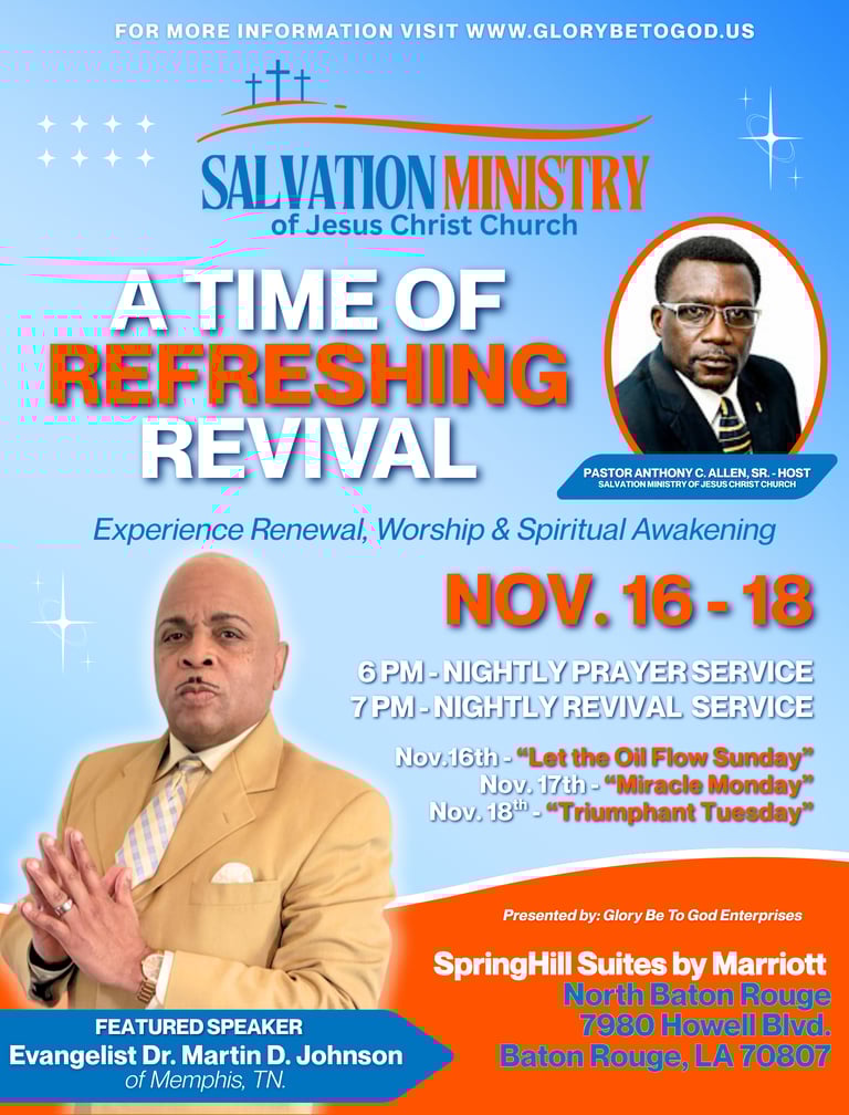 Salvation Ministry of Jesus Christ Church (SMJCC) operates under the auspices of Glory Be To God Enterprises and was established by Pastor Anthony C. Allen, Sr. At the heart of our church's mission is the unwavering belief that the salvation of every individual, whether a member or not, is of utmost importance. It is the sacred duty of all believers to seek out the lost and guide them toward salvation. To emphasize our commitment to this vital mission, we proudly embrace the slogan, "Your salvation is our priority!"